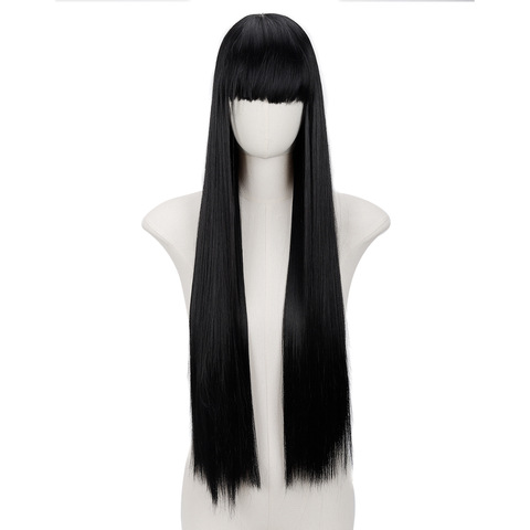 Peluca negra recta larga de 80cm de tamaño pequeño, frente de encaje transparente, esponjoso Natural flequillo, peluca de Cosplay de Lolita, fibra de alta temperatura