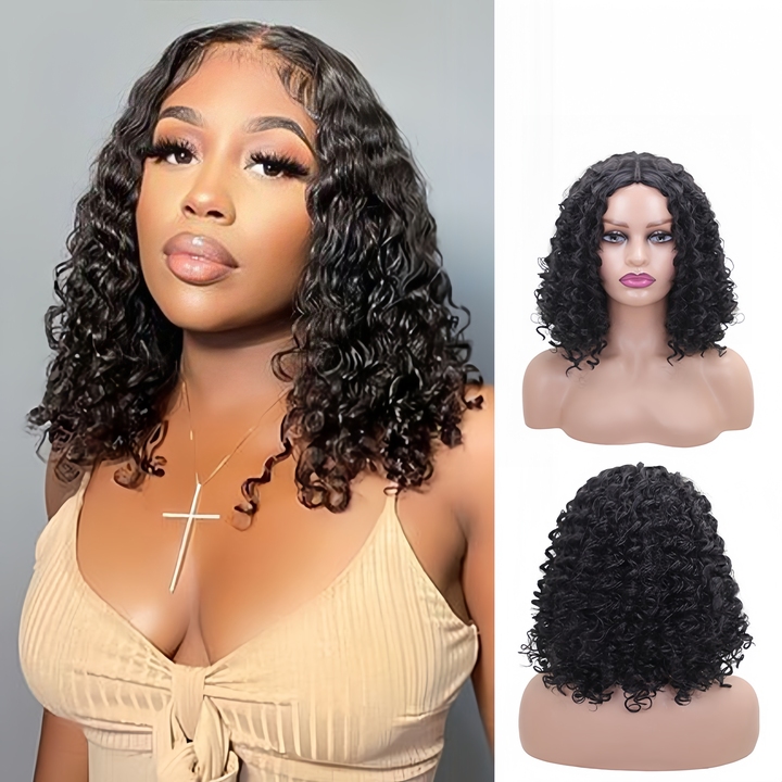 Vente en gros 14 pouces naturel noir sans colle haute température fibre Bob court crépus Curl vague profonde Extensions synthétiques dentelle longue